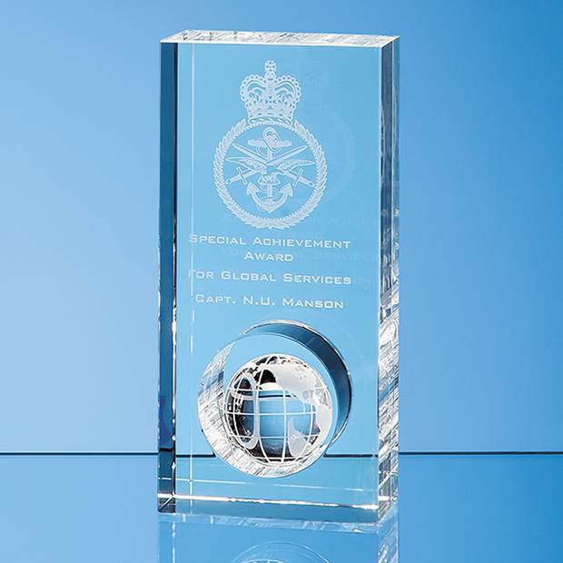 The simple yet stylish 17cm Globe in the Hole Award is produced using the finest quality optical crystal and features a globe that is mounted in a circular hole in the lower part of the rectangle. The award is perfect for global, travel or transport based companies and can be decorated with and crest, logo or wording using 2D or 3D sub surface engraving, full colour printing or sandblast engraving. The award is supplied in a foam lined presentation box.
