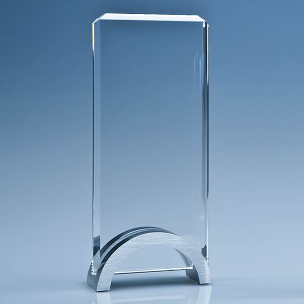This ultra stylish modern looking award perfectly combines a 17.5cm optical crystal rectangle which is mounted onto a brushed aluminium base to create an exquisite recognition, achievement or incentive gift. The rectangle can be personalised with any crest, logo or wording to create an award that is sure to take pride of place when put on display at home or at work. It is supplied in an individual gift box.