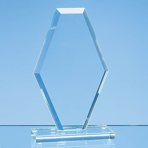 The stylish facet clipped diamond award is crafted out of 1cm thick jade glass and is mounted on a rectangular base. It is an elegant design that can be personalised with any logo, crest or wording and presented as an achievement award or gift. The award is also available in 22cm and 24cm.