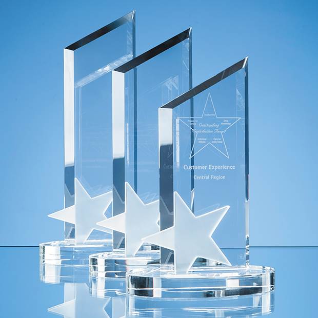 Celebrate recognition or a win with this flawless optical crystal peak award with a frosted star at the base. Available in three sizes 22cm shown 26cm and 30cm it is ideal to use as a standalone presentation recognition or award but also for 1st 2nd and 3rd place achievement whether sporting academic or corporate. With a generous area to engrave a crest company logo or message it comes in its own foam lined presentation box.