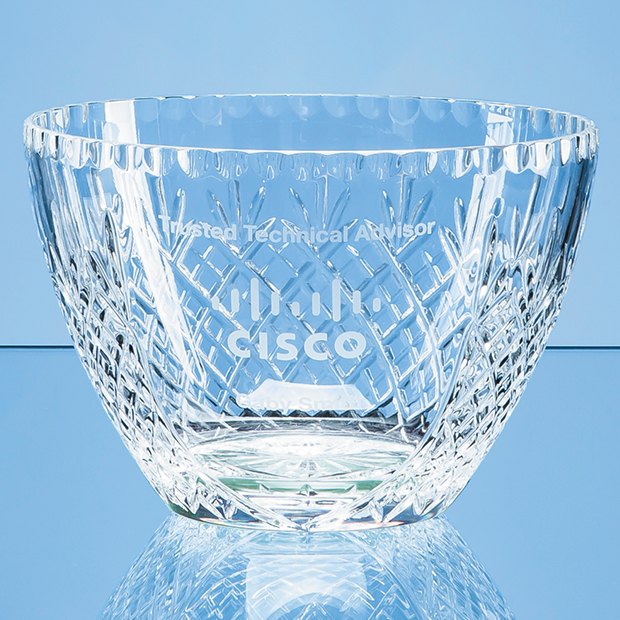 The lead crystal fruit bowl is beautifully designed with a traditional diamond cut pattern with engraving panel. There is a large engraving area in the panel that can be personalised with any logo, crest of wording to create a great gift idea that is sure to be displayed with pride.