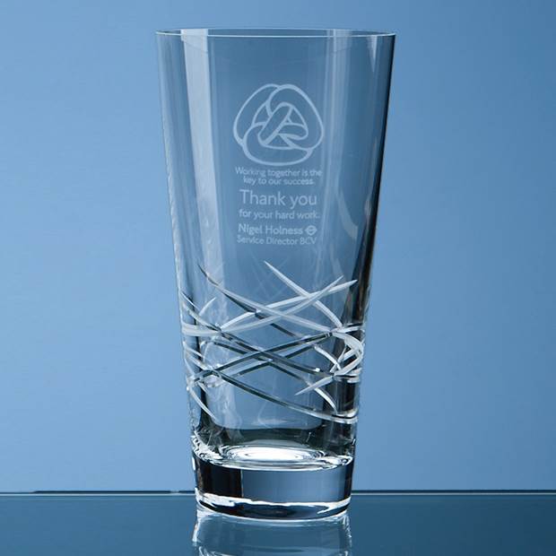 The contemporary style of the 20.5cm Tiesto conical vase is enhanced with a stylish cut pattern around the base of the vase. There is a large engraving area that can be personalised with any crest, logo or wording to create a gift that is sure to be treasured by the recipient. The Tiesto vases are available in 3 sizes making them perfect for 1st, 2nd and 3rd place competition prizes. The vase is supplied in an attractive gift box.