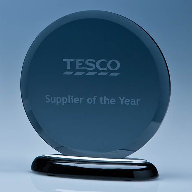 This exquisite 15.5cm Circle award perfectly combines 3 different materials of smoked glass that is bonded into a brushed aluminium section and mounted onto the black piano finish wood base. The glass circle has a large engraving area that can be personalised with any crest, logo or wording to create an award that is sure to take pride of place when put on display at home or at work.