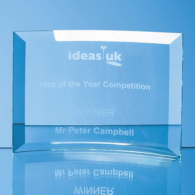 The jade glass curves are available in 4 sizes and are ideal as recognition awards to put on display at work or at home. They have a polished edge, bevel on all 4 sides and a large engraving area that can be personalised with any logo, crest and wording to mark a sales achievement, sporting success or just to acknowledge a job well done. They are supplied in individual white gift boxes.
