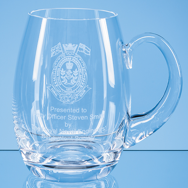 A sturdy beer tankard handmade from sturdy glass that is ideal for engraving. This tankard can also be decorated with our colour decals so is a great item for conveying your brand or messaging in a more eye-catching way.